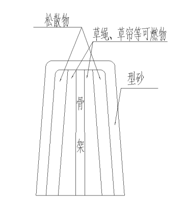 鋼錠模鑄造工藝設(shè)計中,排氣方式是首要考慮的一個問題,主要是因?yàn)樗A皾沧⑦^程中發(fā)氣量大,如工藝設(shè)計不合理,容易造成氣孔等缺陷,由于鋼錠模底眼直徑較小,故采用下排氣方式,同時芯核造型工藝由原三部分組成提高至四部分組成,由內(nèi)到外依次為帶骨架(采用帶放氣孔的焊管,依據(jù)芯核大小,直徑隨之變化)、其次焊管外裹草簾、草繩、報紙等易燃物、再次可移動松散物(碎磚、碎瓦等)、最終型砂(水玻璃砂),具體詳見圖1。