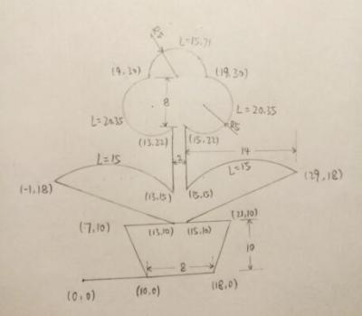 10) 按提示,輸入終點(diǎn)(19,30),弧長(zhǎng)L=20.35,逆。>0),按Enter鍵;輸入終點(diǎn)(9,30),弧長(zhǎng)L=15.71,逆。>0),按Enter鍵;輸入終點(diǎn)(13,22),弧長(zhǎng)L=20.35,逆。>0),按Enter鍵;按Esc鍵退出,再單擊“退出”返回主頁(yè)面。