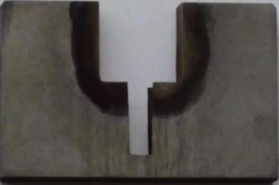 嘗試感應器加熱部分采用梯形截面銅管,調(diào)整好加熱面與開口槽底面的間隙,用5.8kHz 頻率、90kW短時間加熱進行淬火,整個開口槽兩側硬化層深度、硬度均達到技術要求,開口槽底面、直角處也有硬化層(見圖6),變形量也很。ㄒ姼奖恚蛻艉軡M意。
