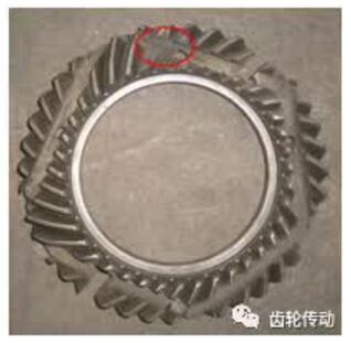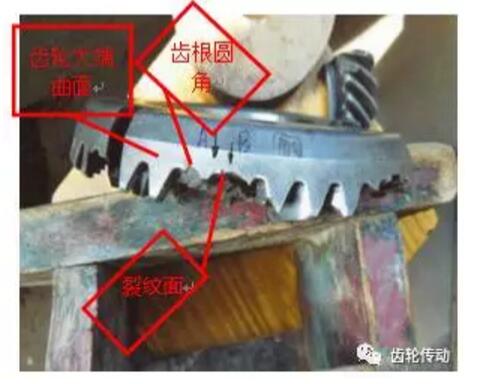 (1)位置:位于齒輪齒根圓角處。(2)形狀:裂紋面在齒的大端曲面與齒根圓面向下成約18-20度的角度,斷裂位置正是輪齒受力最大的位置。