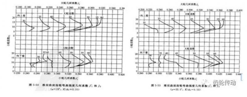 通過觀察《齒輪彎曲強度幾何系數(shù)線圖》(如下圖)發(fā)現(xiàn),對于同樣的主動齒數(shù)(10),被動齒輪幾何系數(shù) J2隨齒輪壓力角的增大而增大。由此可知,增大齒輪壓力角可以減小齒輪的計算齒根應(yīng)力ϬF ,進而增大齒輪的彎曲強度。